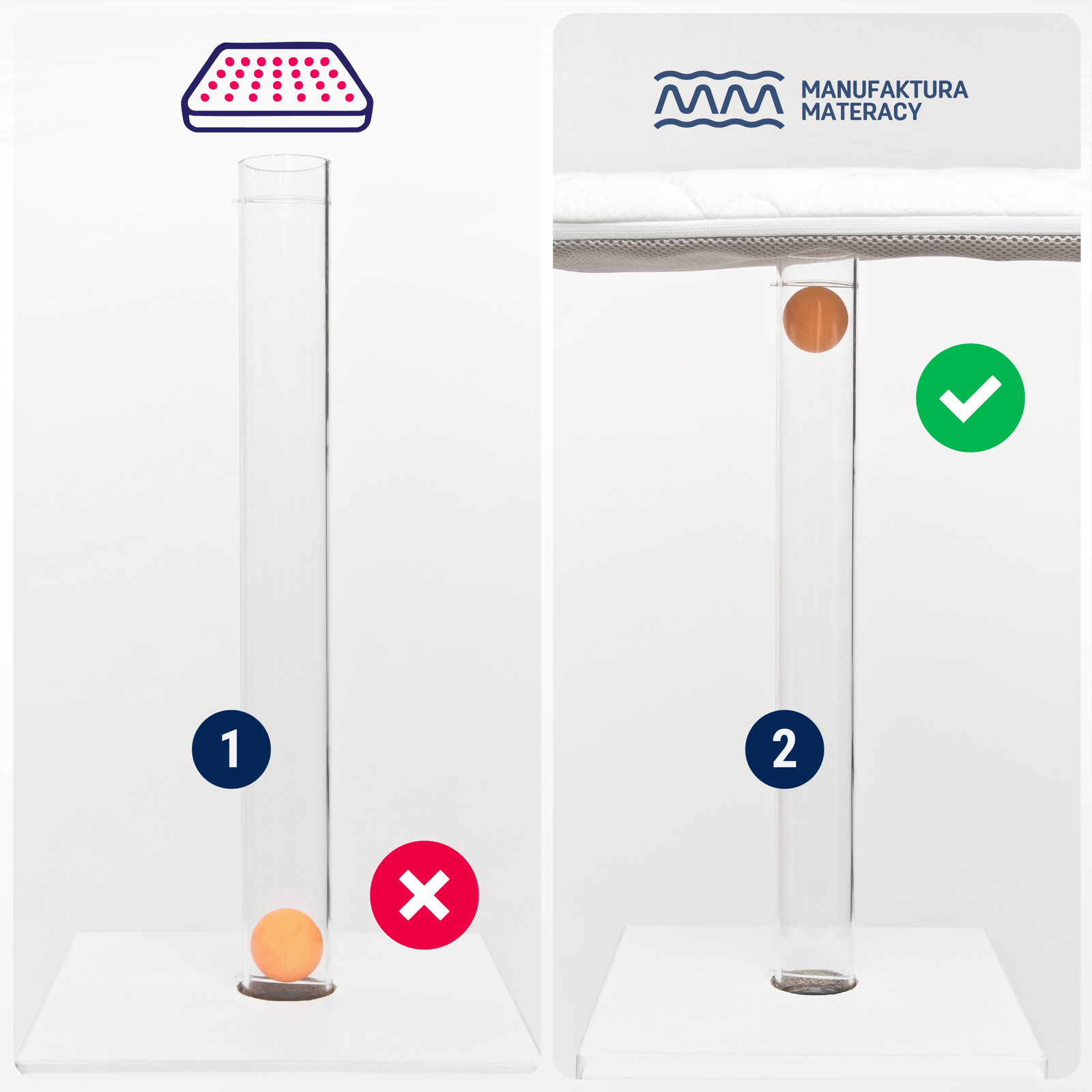 2️⃣ Nasz materac z siatką wentylującą: piłeczka nie opada = świetny przepływ powietrza