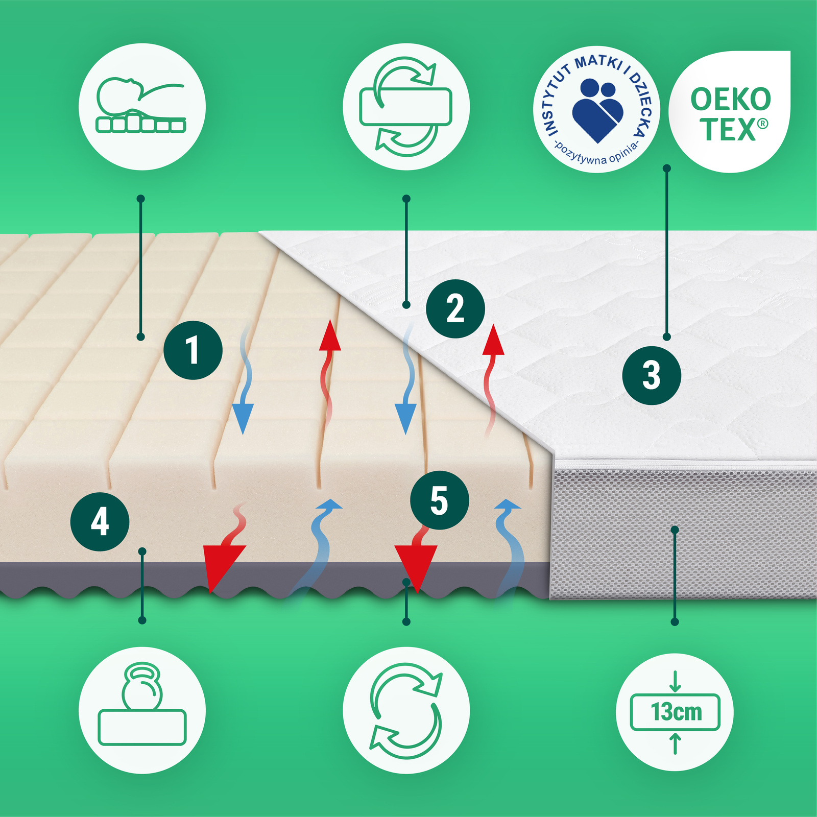 ⚠️ Uwaga: Dobra wentylacja materaca zmniejsza ryzyko śmierci łóżeczkowej