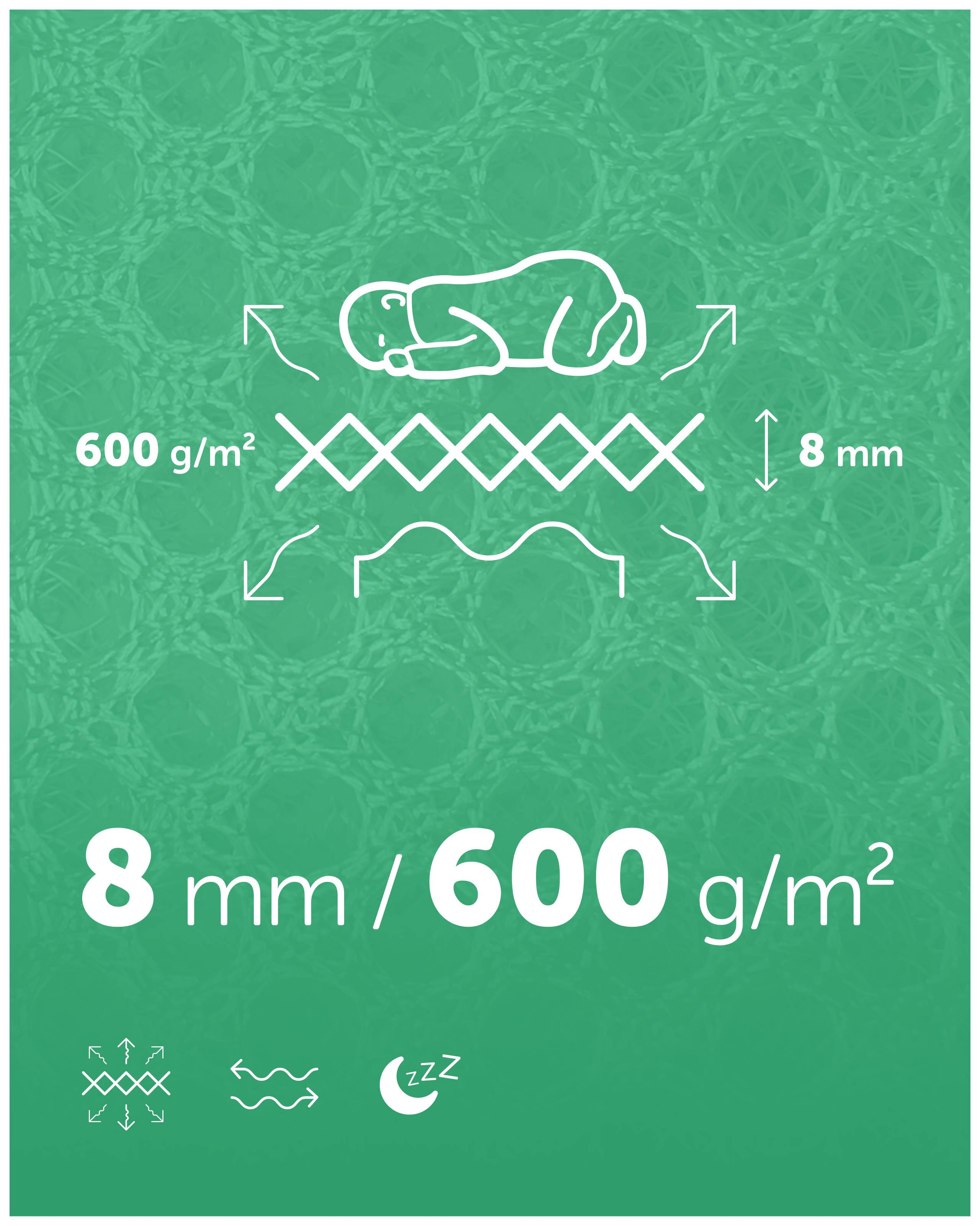 Zastosowana w materacu siatka przestrzenna 3D wspiera naturalny proces termoregulacji dziecka, umożliwiając stały przepływ powietrza wewnątrz jego struktury.