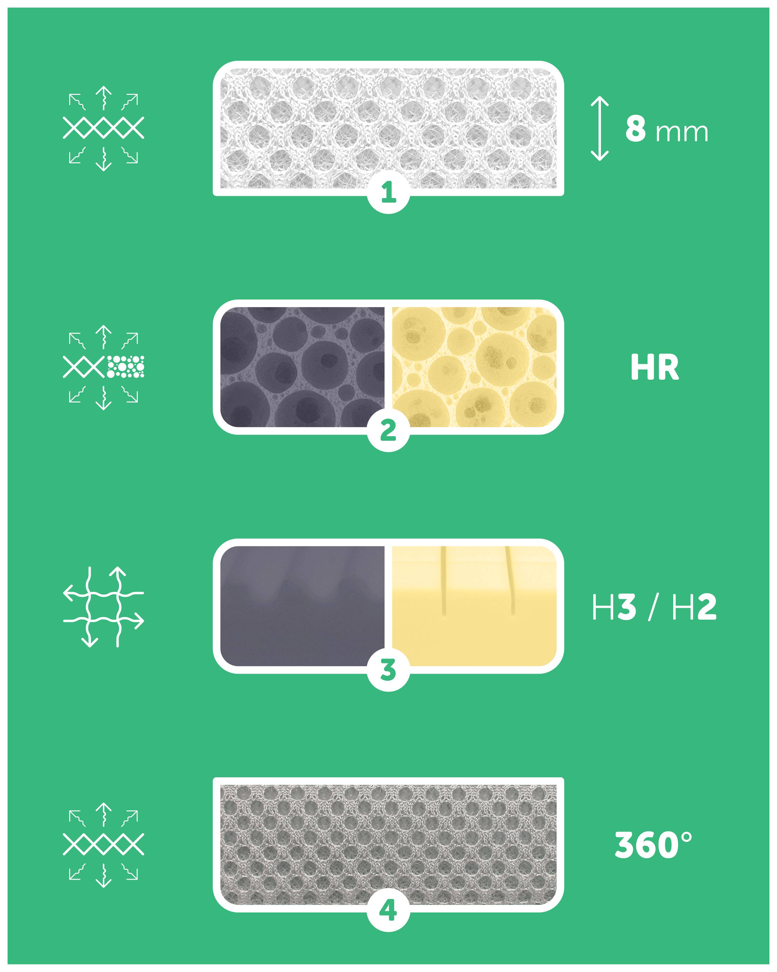 Strona H2 (panele piankowe) + pokrowiec SIATKA 3D (FRESH) – sprężyste wsparcie i skuteczna wentylacja w czasie ruchu i snu.