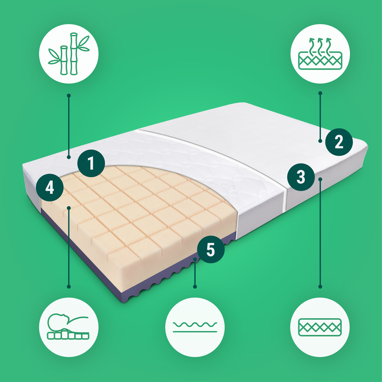 1. Stworzony przez Mamę Fizjoterapeutę W oparciu o jej doświadczenie jako fizjoterapeuty dziecięcego i mamy piątki dzieci – materac został zaprojektowany z myślą o zdrowym i bezpiecznym rozwoju maluszka od pierwszych dni życia. 2. System wentylacji w materacu Lepsza higiena snu i wyjątkowy komfort cieplny Twojego maluszka, dzięki połączeniu poziomych kanałów wentylacyjnych, siatki oddychającej na powierzchni do spania oraz siateczki oddychającej po boku. 3. Wspólne korzystanie rodzica z dzieckiem Zalecamy układać dziecko na stronie z pianką HR (żółta) – dzięki niezależnym panelom piankowym skutecznie tłumi ruchy dorosłego, co szczególnie przydaje się, gdy rodzic wstaje w nocy i nie chce obudzić malucha.
