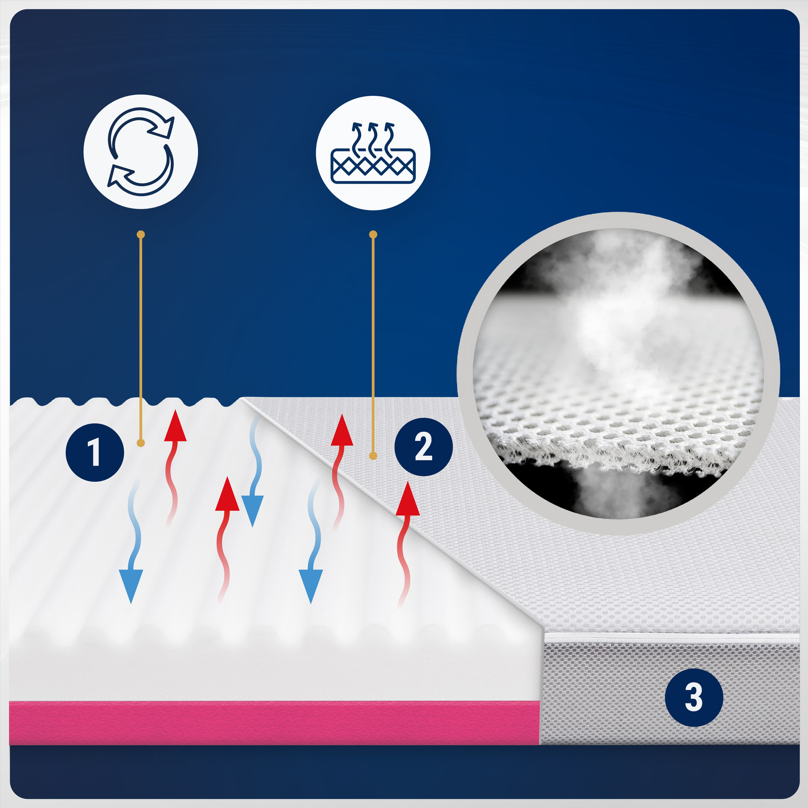 3️⃣ Siateczce wentylującej 3D na bokach – współpracuje z kanalikami wentylacyjnymi materaca, odprowadzając zgromadzoną wilgoć.