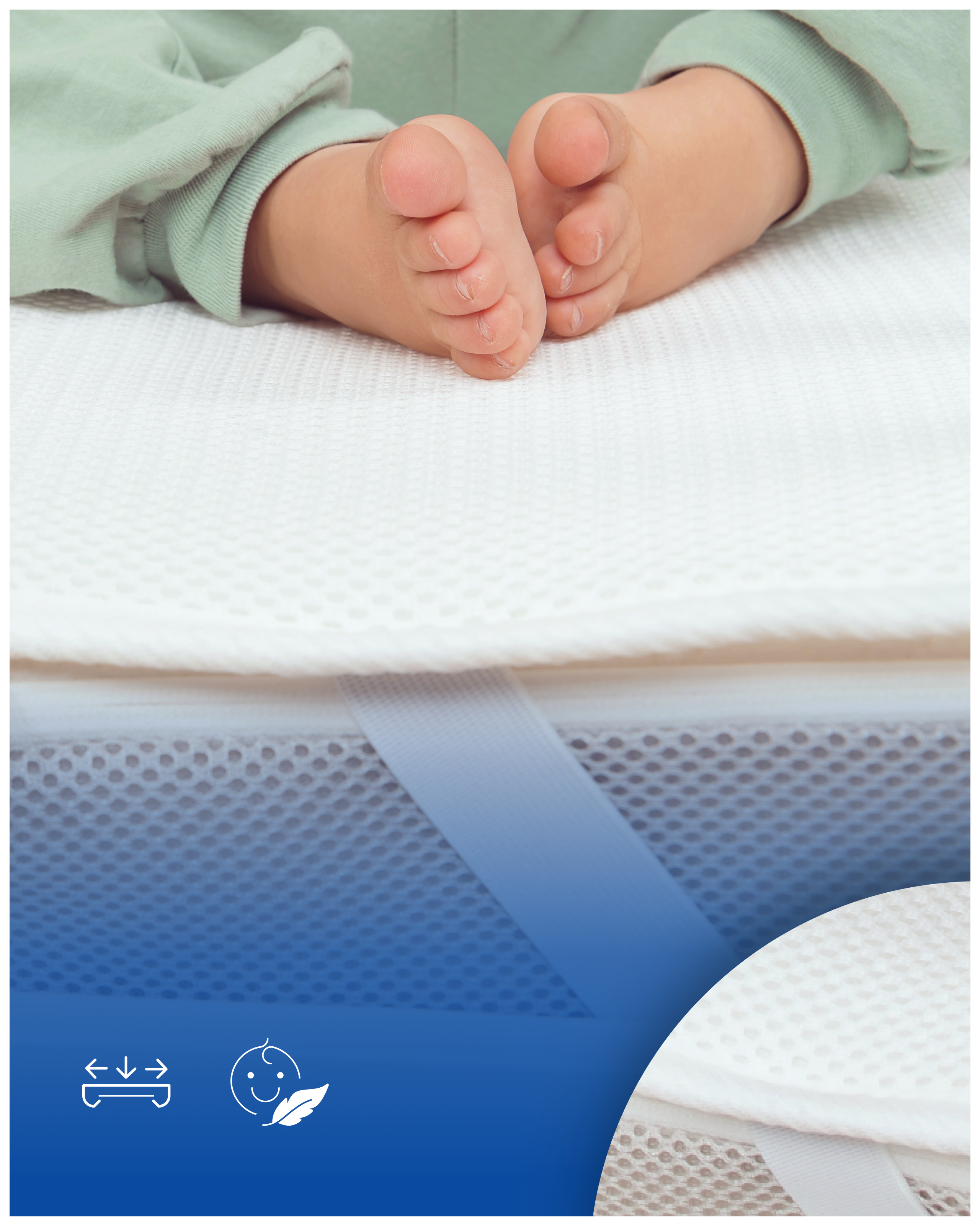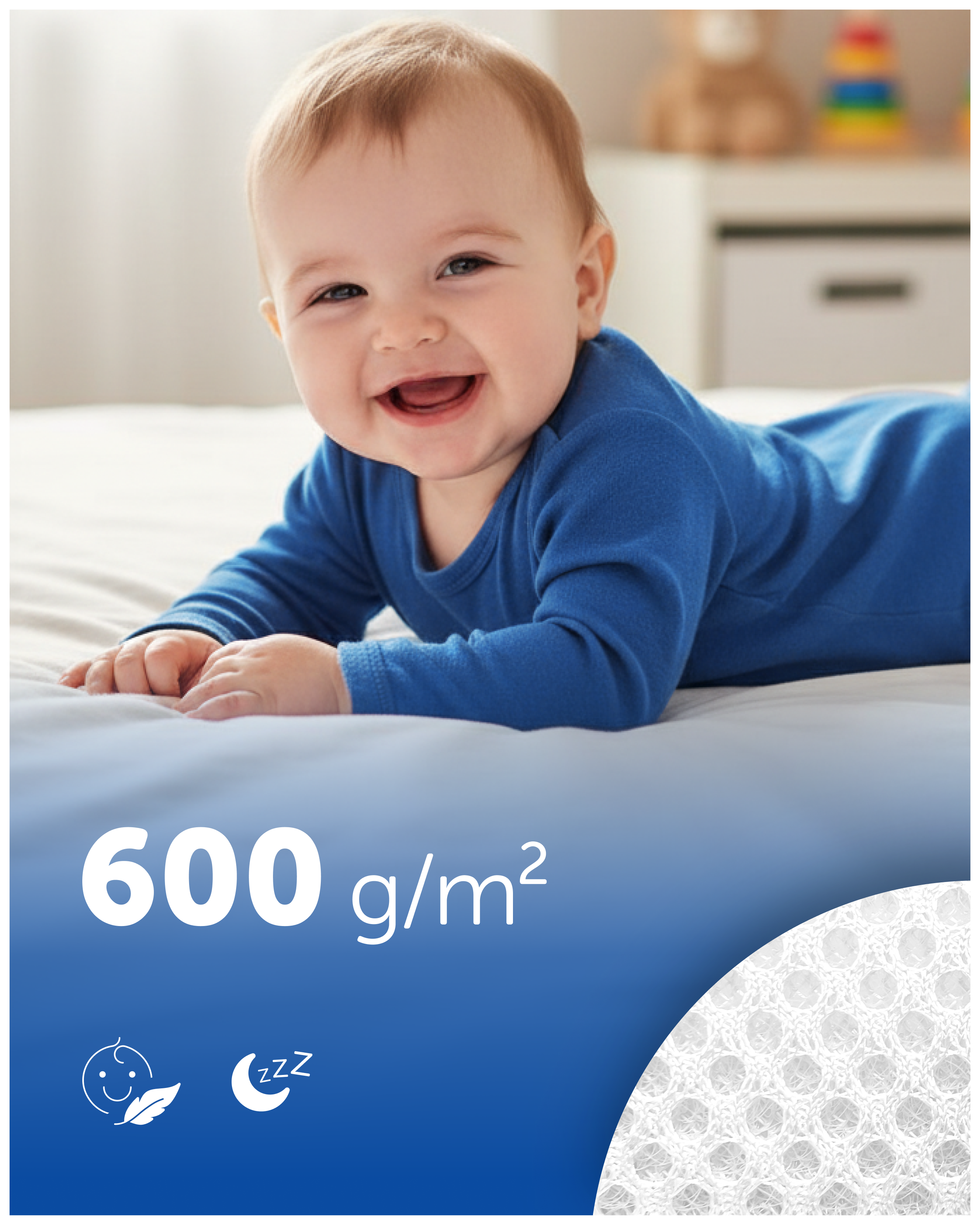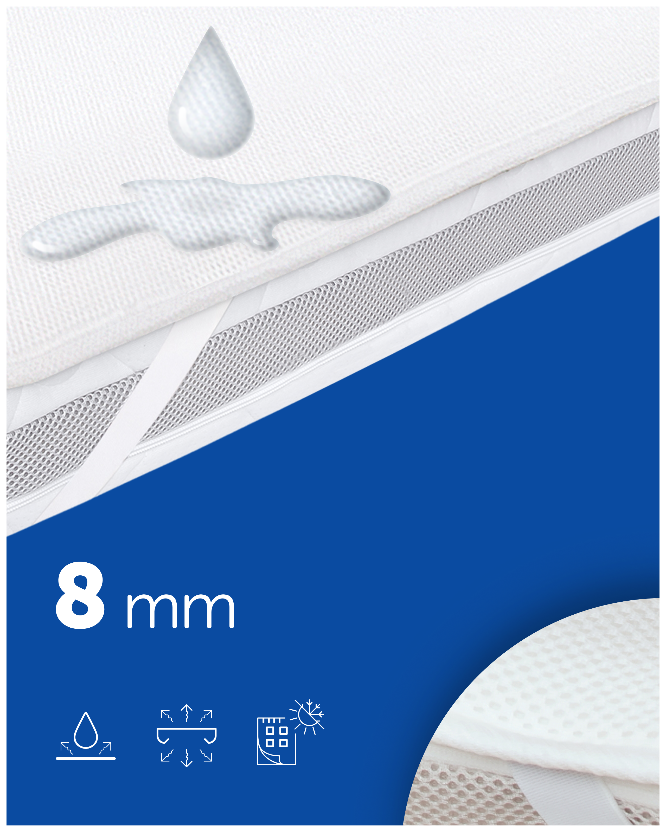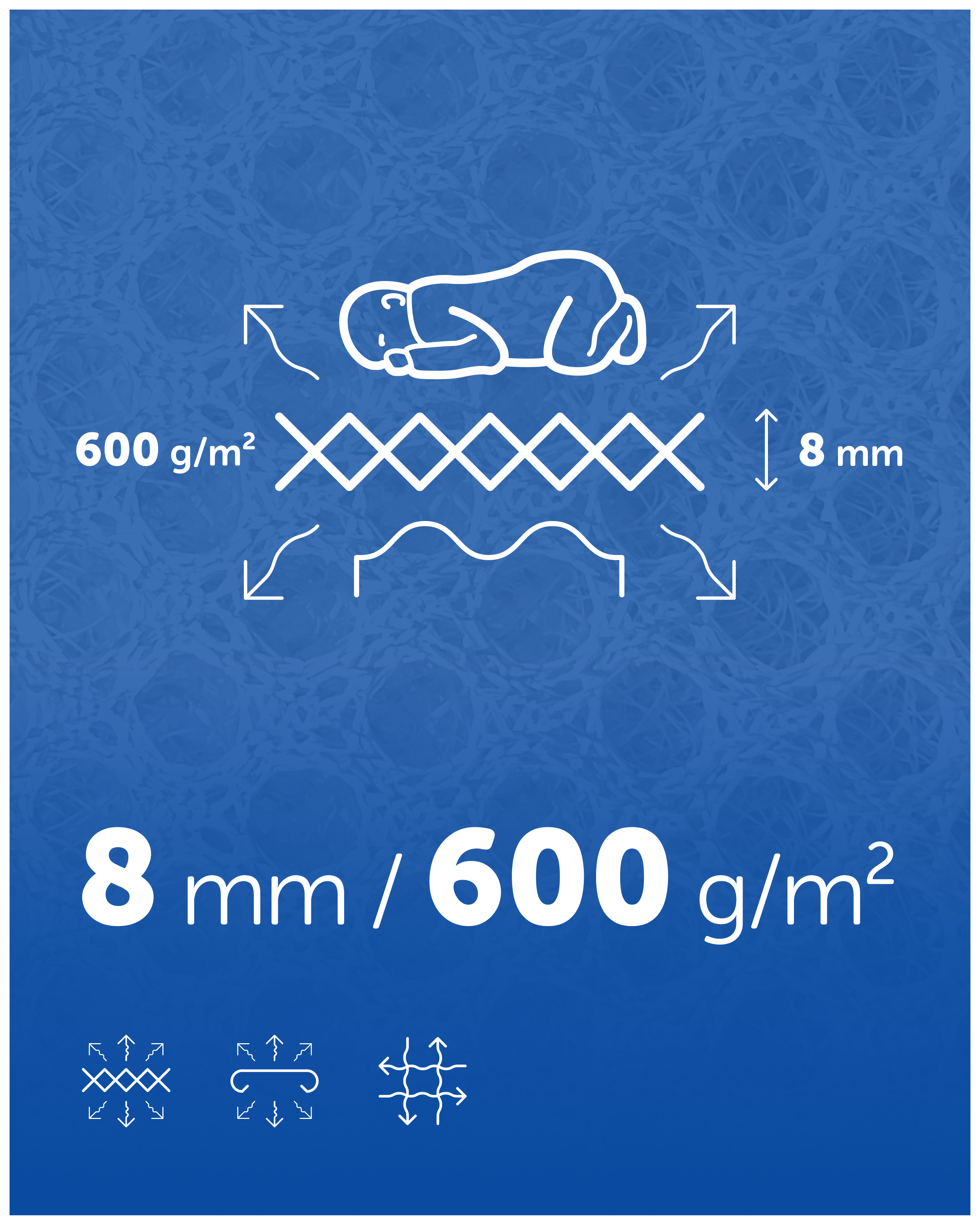 Dzięki 8 mm wysokości zachowuje swoją strukturę pod ciężarem dziecka i osoby dorosłej, pomagając ograniczyć gromadzenie ciepła i wilgoci.